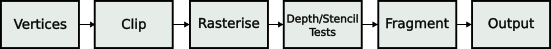 The main core of WebGL is built around a fixed function pipeline shown above. It takes the collection of vertices, connected together as triangles (or other polygons) and processes them for visualisation on the screen/canvas. Some parts of the pipeline such as Vertices and Fragment can be controlled through custom shaders, but overall the pipeline proceeds in much the same way for every render. The final output framebuffer which is populated from the fragment shader is the color buffer.